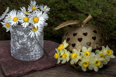 Keywords: still life flowers daisy stones daffodils moss