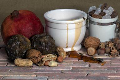 Keywords: still life fruits nuts passion fruit food honey pomegranate
