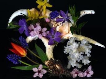 Keywords: still life mussels flowers coral tulips