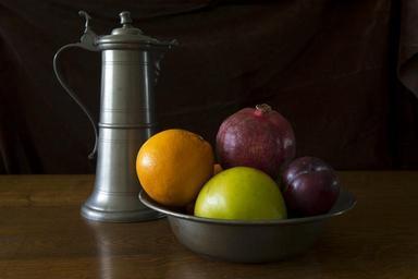 Keywords: still life pewter ewer pewter bowl fruit orange apple pomegranate plum oak table side lit