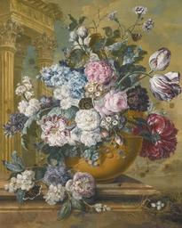 | Keywords: Still Life of Summer Flowers in a Bowl, with Butterflies by Jacobus Linthorst.jpg en Still Life of Summer Flowers in a Bowl with Butterflies and a Bird's Nest Upon a Marble Ledge a Temple Beyond by Jacobus Linthorst 1796 oil on canvas 78 by 63 3 cm Sotheby's Jacobus Linthorst 1796 Jacobus Linthorst PD-old-100 |