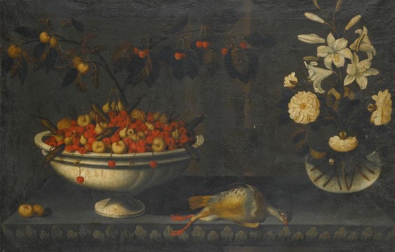 | Keywords: Still Life with a Bowl of Cherries and Other Fruit by Bernardo Polo.jpg  en Still Life with a Bowl of Cherries and Other Fruit a Glass Vase of Lilies to the Right by Bernardo Polo c 1650-75 oil on canvas 73 by 112 cm Sotheby's Bernardo Polo c 1650-75 Bernardo Polo Paintings of cherries PD-old-100  |