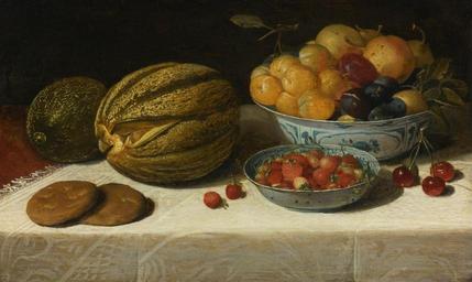 | Keywords: Still life with melons, plums, cherries, and bread on a table by Floris van Dijck, 1628.jpg en Still life with melons plums cherries and bread on a table draped with a white damask tablecloth by Floris van Dijck 1628 oil on oak panel 28 by 45 5 cm Sotheby's Floris van Dijck 1628 Floris van Dyck PD-old-100 |