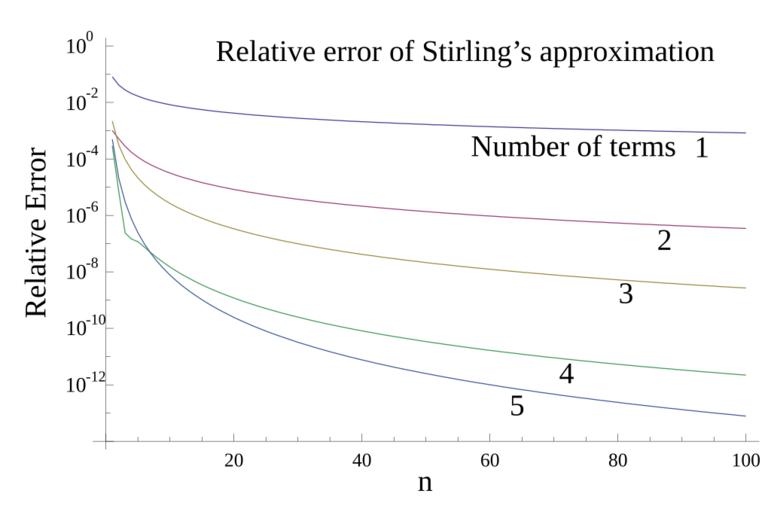 Keywords: StirlingErrorGraphBB.svg en Relative Error of Stirling's approximation for n from 1 to 100 with 1 to 5 terms Own DMJ001 2009-02-15 No Computed in Mathematica with 400 digit precision Stirling's approximation