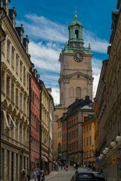 Keywords: stockholm sweden church old town building alley belfry clock history