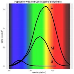 | Keywords: Stockmansharpe10degCMFadj2000 popconsens.svg en Population weighted L 63 M 31 S 6 cone spectral sensitivities from Stockman and Sharpe using 'colorscience' package for R Source code library ggplot2 library tidyr library colorscience library ggspectra o df<-StockmanSharpe10degCMFS2000 colnames o df c wavelength L M S o df lms<-c L M S lin df<-o df lin df lin df L<-lin df L 0 63 lin df M<-lin df M 0 31 lin df S<-lin df S 0 06 t df <- lin df > gather cone type response L S t df response ggplot t df aes x wavelength y response group cone type + stat_wl_strip alpha 0 4 ymin -Inf ymax Inf + scale_fill_identity +geom_line color black size 2 +geom_text data t dft df wavelength 590 aes label cone type size 8 hjust 0 vjust -1 +labs title Population Weighted Cone Spectral Sensitivities x wavelength nm y cone sensitivity +xlim 400 680 + theme text element_text size 10 ggsave stockmansharpe10degCMFadj2000_popconsens svg cc-zero Color vision |