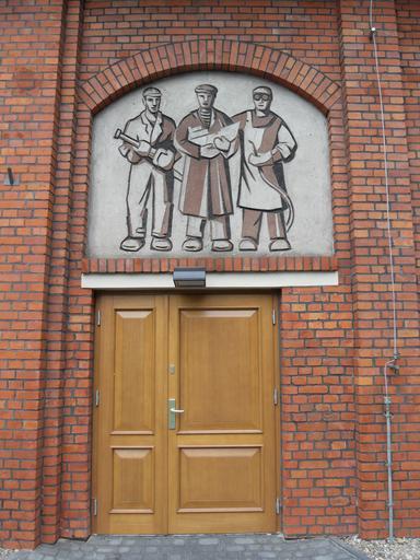 Keywords: Stocznia Gdańska Sala BHP - drzwi.JPG pl Stocznia Gdańska sala BHP own Artur Andrzej 2011-08-18 Cc-zero 1 Doki Street in Gdańsk Doors in Gdańsk Reliefs in Gdańsk
