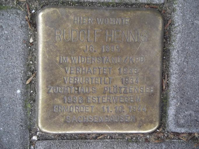 Keywords: Stolperstein Düsseldorf 1 Pempelfort Fischerstraße 21 Rudolf Hennig.jpg de Hier wohnte Rudolf Henning Jg 1895 im Widerstand / KPD verhaftet 1933 verurteilt 1934 Zuchthaus Plötzensee 1936 Esterwegen ermordet 11 10 1944 Sachsenhausen 2016-04-16 17 09 43 own Harald Malte Schwarz other versions cc-zero Stolpersteine in Düsseldorf-Pempelfort |