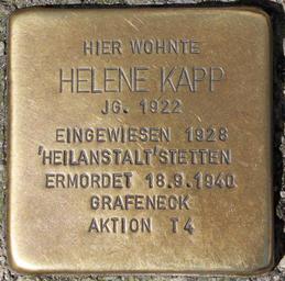 | Keywords: Stolperstein Stuttgart - Gablenberger Hauptstraße 34 - Helene Kapp.jpg de Stolperstein für Helene Kapp Hier wohnte<br />Helene Kapp<br />Jg 1922<br />Eingewiesen 1928<br />'Heilanstalt'Stetten<br/ >Ermordet 18 9 1940<br />Grafeneck<br />Aktion T4 2016-08-14 12 26 02 own Zinnmann other versions cc-zero Stolpersteine in Stuttgart Stolpersteine Aktion T4 | ||||