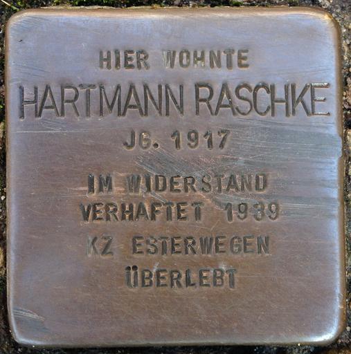 Keywords: Stolpersteine Bremerhaven – Hartmann Raschke.JPG de Stolperstein in Bremerhaven Person Hartmann Raschke Lage Bürgermeister-Smidt-Straße 45a Bremerhaven-Mitte Inschrift »Hier wohnte Hartmann Raschke Jg 1917 im Widerstand verhaftet 1939 KZ Esterwegen überlebt« en Stolperstein in Bremerhaven Person Hartmann Raschke Position Bürgermeister-Smidt-Straße 45a Bremerhaven-Mitte Inscription Hier wohnte Hartmann Raschke Jg 1917 im Widerstand verhaftet 1939 KZ Esterwegen überlebt 2014-02-13 16 23 10 own FlorianKlu 53 32 38 01 N 8 34 45 06 E alt 23_source exif_heading 240 630252 cc-zero Stolpersteine in Bremerhaven Uploaded with UploadWizard |