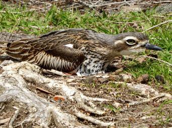 Keywords: stone curlew burhinus oedicnemus nesting bird ornithology birdlife charadriiformes reproductive eye wildlife camouflage pattern brown closeup nature