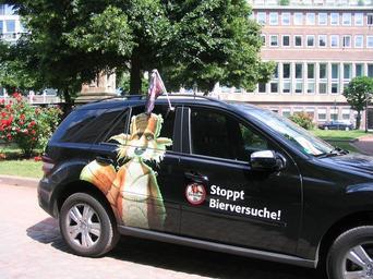 | Keywords: Stoppt Bierversuche.jpg Stoppt Bierversuche einer der Slogans einer witzigen Werbekampagne der Altbier-Brauerei Füchschen in Düsseldorf Aufgenommen in der Orangeriestraße am Maxplatz Own 2010-06-25 Stöhrfall <span class signature-talk >talk</span> 19 17 25 June 2010 UTC Altbier Maxplatz Düsseldorf Foxes in art Beer advertisements on automobiles Animal testing Breweries in Düsseldorf 2010 in Düsseldorf Mercedes-Benz W164 2008 | ||||