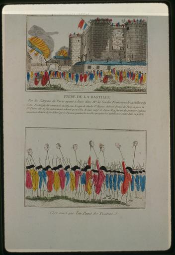 | Keywords: Storming the bastille.jpg Bastille Prison a 1789 French hand tinted etching that depicts the storming of the Bastille during the French Revolution English translation First caption Bastille Prison The citizens of Paris led by the Gardes Françaises on 14 July 1789 Building of this fortification commenced in 1369 during the reign of Charles V Hugues Aubriot a native of Dijon and Provost of Paris laid the first stone Construction was completed in 1382 Aubriot was born in Dijon He became one of the first prisoners of the Bastille imprisoned under the pretext of heresy He was liberated by the Parisians during the troubles that stirred the capital and escaped to his motherland Second caption This is how the traitors were punished Library of Congress DIGITAL ID color film copy slide cph 3b51512 http //hdl loc gov/loc pnp/cph 3b51512 b w film copy neg cph 3b41648 http //hdl loc gov/loc pnp/cph 3b41648 1789 Author Unrestored version of Image Storming the bastille 4 jpg PD-old-100 Storming of the Bastille 14 July 1789 |