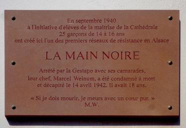 | Keywords: Strasbourg Collège Saint Étienne plaque Marcel Weinum Main Noire.jpg fr Plaque commémorative à la mémoire de Marcel Weinum et du groupe de résistance La Main Noire à Strasbourg own photo personnelle Claude Truong-Ngoc - ctruongngoc 2009-06 Marcel Weinum Plaques commemorating the French Resistance Plaques in Strasbourg Strasbourg in the 20th century World War II memorials in Alsace Objets par Claude Truong-Ngoc Collège Saint-Étienne Strasbourg Plaques referencing 1940 Plaques referencing 1942 |
