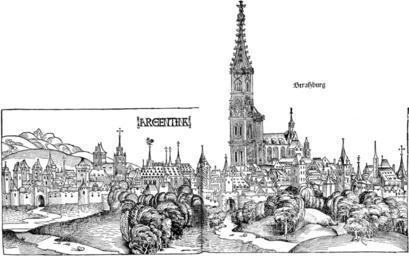 | Keywords: Strasbourg, woodcut from Schedel's Weltchronik (1493).png Archival version Strasbourg woodcut from Schedel's Weltchronik 1493 compressed jpg PNG Strasbourg in France around 1490 Straßburg im Elsass um 1490 Nuremberg Chronicle Nuremberg 1493 fol cxxxix verso and cxl recto This is one of the famous realistic town views from Schedel ™s work de Holzschnitt aus Hartmann Schedels Weltchronik Nürnberg 1493 fol cxxxix verso and cxl recto Dies ist eine der berühmten realistischen Stadtansichten in Schedels Werk en Drawn around 1490 published in 1493 de Um 1490 gezeichnet 1493 veröffentlicht Woodcuts by Michel Wolgemut Wilhelm Pleydenwurff text Hartmann Schedel <gallery> File Strasbourg woodcut from Schedel's Weltchronik 1493 compressed jpg Low-res version of this scan File Schedelsche Weltchronik d 139 jpg The complete pages with text </gallery> PD-old-100 Historic views of Notre-Dame de Strasbourg 1493 Historic views of Strasbourg Nuremberg Chronicle illustrations f 131-140 139v Nuremberg Chronicle Towns |