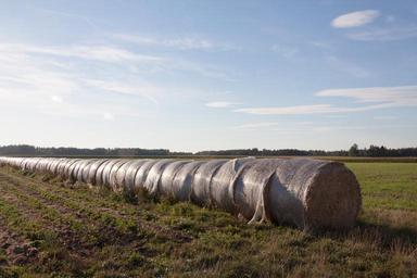 Keywords: straw bale rolled agriculture hay harvest landscape summer cereals hay bales nature clouds sky round bales field straw harvest stock wrapped up back light