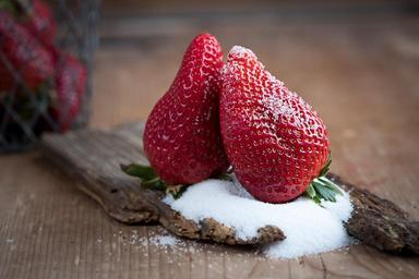 Keywords: strawberries red frisch ripe pair two two piece natural product eat nutrition food bless you sweet soft fruit fruit vitamins minerals vital substances healthy close food-photography sugar granulated sugar white