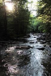 Keywords: stream rocks sun through trees landscape summer nature woods creek
