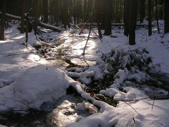Keywords: stream winter forest cold snow trees logs woods landscape scenic scene outdoors rocks