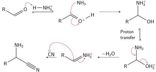 | Keywords: Strecker's amino acid synthesis mechanism part 1.svg en Strecker's amino acid synthesis mechanism part 1 own Krishnavedala 2014-08-05 validSVG LaTeX source code 250px <syntaxhighlight lang latex > \documentclass12pt border 1pt standalone \usepackageT1 fontenc \usepackageutf8 inputenc \usepackage chemfig chemmacros \usepackage lmodern \chemsetupchemformula font-shape sf format \sffamily \renewcommand \printatom1 \ensuremath \mathsf 1 \setatomsep 2 5em \setdoublesep 6ex \setarrowdefault 1 25 \setbondstyle thick \renewcommand \familydefault \sfdefault \begin document \schemestart \chemfig R- -30 30 a1 O \arrow < >\chemfig a2 H- 8NH_3 \scriptstyle+ \subscheme \chemfig \qquad b1 NH_3 \arrow 0 -90 0 3 \chemfig R- 30 b22 b2 -30 b3 O +- 30H \arrow -> \chemfig R- 30 - 60NH_3 \scriptstyle+ - -30OH \arrow < > 0 \parbox 1 5cm \small Proton transfer -90 9 \chemfig R- 30 - c2 60 c1 NH_2 - c3 -30 c4 OH_2 \scriptstyle+ \arrow -> - \chemfig H_2O 180 \chemfig R- -30 d1 d2 30 d3 NH_2 \scriptstyle+ \arrow ->\chemfig d0 \chemabove C \scriptstyle\ominus N 180 8 \chemfig R- 30 - 60NH_2 - -30~ 0N \chemmove-> red shorten < 2pt shorten > 2pt -stealth \draw a1 controls + north 8mm and + north west 5mm a2 ; \draw b1 controls + west 5mm and + north 5mm b22 ; \draw b2 controls + south west 8mm and + south west 8mm b3 ; \draw c1 controls + west 5mm and + west 5mm c2 ; \draw c3 controls + north 5mm and + north 5mm c4 ; \draw d2 controls + south 5mm and + south 5mm d3 ; \draw shorten < 8pt d0 controls + north 15mm and + north 15mm d1 ; \schemestop \end document </syntaxhighlight> cob Strecker reaction Cc-zero |