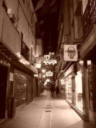 Keywords: street commercial closed night christmas ornaments bright pedestrian calm silence showcase walk strait old shops