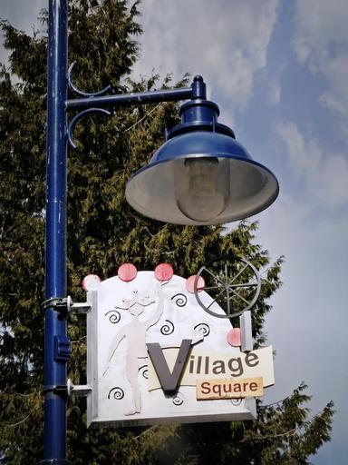Keywords: street lighting fixture blue sign whistler village british columbia canada cloudy sky