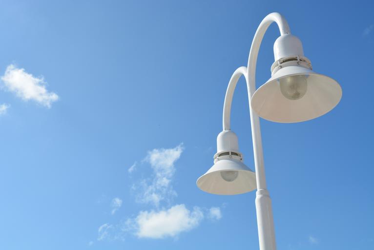 Keywords: street lights sky blue clouds city light lamp lantern streetlight pole lamppost streetlamp street-light bulb modern equipment