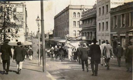 | Keywords: brisbane march protest banners edward street edwardstreet cru årgang jahrgang vendimia road This street march is going down Edward Street towards Adelaide Street in Brisbane. The men with white helmets are policemen and there appears to be a couple of women in long skirts in the group. I can't tell what is written on the banners unfortunately. This street march is going down Edward Street towards Adelaide Street in Brisbane. The men with white helmets are policemen and there appears to be a couple of women in long skirts in the group. I can't tell what is written on the banners unfortunately. |
