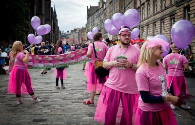 Keywords: street performers edinburgh fringe actors performers balloons pink costumes people expression adult artist face human pose female