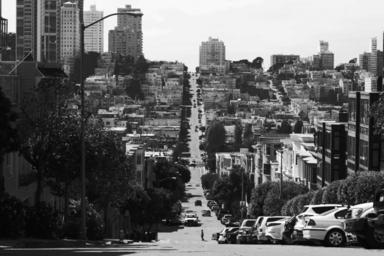Keywords: street road city urban hill cars parked trees traffic houses buildings apartments asphalt concrete residential area steep black and white