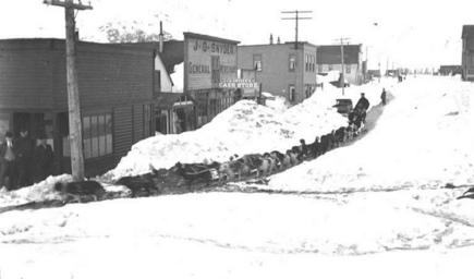 | Keywords: Street scene during winter showing dog sled with passengers, Valdez, ca 1912 (THWAITES 249).jpeg check categories 27 October 2016 6 Photograph Creator John E Thwaites Caption on image Valdez Alaska PH Coll 247 532<br/>Valdez is located on the north shore of Port Valdez a deep water fjord in Prince William Sound It lies 305 road miles east of Anchorage and 364 road miles south of Fairbanks It is the southern terminus of the Trans-Alaska oil pipeline The Port of Valdez was named in 1790 by Don Salvador Fidalgo for the celebrated Spanish naval officer Antonio Valdes y Basan Due to its excellent ice-free port a town developed in 1898 as a debarkation point for men seeking a route to the Eagle Mining District and the Klondike gold fields Valdez soon became the supply center of its own gold mining region and incorporated as a City in 1901 Fort Liscum was established in 1900 and a sled and wagon road was constructed to Fort Egbert in Eagle by the U S Army The Alaska Road Commission further developed the road for automobile travel to Fairbanks; it was completed by the early 1920s Tsunamis generated by the 1964 earthquake destroyed the original City killing several residents The community was rebuilt in a more sheltered location 4 miles to the west During the 1970s construction of the Trans-Alaska oil pipeline terminal and other cargo transportation facilities brought rapid growth to Valdez In March 1989 it was the center for the massive oil-spill cleanup after the Exxon VALDEZ disaster In a few short days the population of the town tripled Subjects LCTGM Dog teams--Alaska--Valdez; Passengers--Alaska--Valdez; Snow--Alaska--Valdez; Shops stores--Alaska--Valdez; Utility poles--Alaska--Valdez Subjects LCSH Sled dogs--Alaska--Valdez; Mushers--Alaska--Valdez; Sleds depicted place Valdez Alaska ca 1912 Institution University of Washington UWASH-THWAITES-source accession number thwaites 249 PD-old-auto-1923 1940 Information field Order Number THW273 Images from the John E Thwaites Photographs of Alaska Collection to check Passengers Snow in Alaska Utility poles Sled dogs Mushers Valdez Alaska |