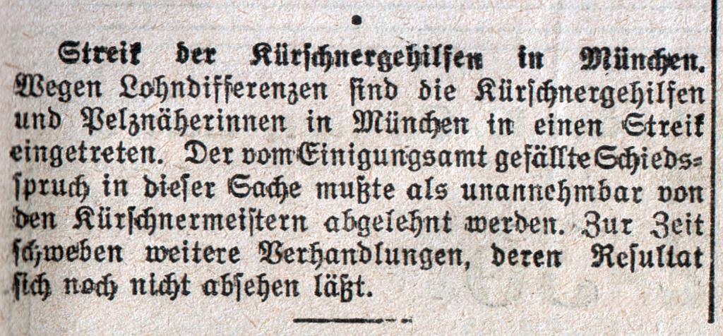 | Keywords: Streik der Kürschnergehilfen in München, 1921.jpg Streik der Kürschnergehilfen in München Wegen Lohndifferenzen sind die Kürschnergehilfen und Pelznäherinnen in München in einen Streik eingetreten Der vom Einigungsamt gefällte Schiedsspruch in dieser Sache mußte als unannehmbar von den Kürschnermeistern abgelehnt werden Zur Zeit schweben weitere Verhandlungen deren Resultat sich noch nicht absehen läßt Oktober 1921 In žDer Rauchwarenmarkt 9 Jg Nr 238 - Berlin 25 Oktober 1921 Tageszeitung Handelszeitung für die gesamte Rauchwaren Pelzwaren-Branche Pelz-Moden Kürschnereibedarf Hut- Mützen-Industrie S 1 Collection G C Franke 1921-10-25 Redaktion žDer Rauchwarenmarkt PD-old Der Rauchwarenmarkt 1921-10-13 Furriers in München Strikes in Germany 1921 in Munich |