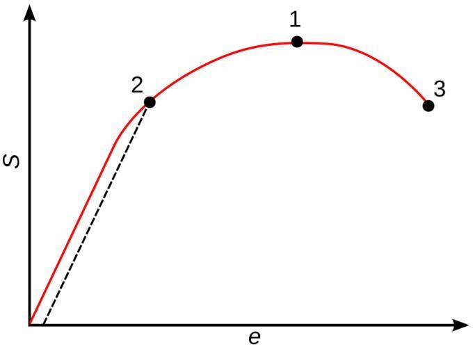| Keywords: Stress-strain curve numbered.svg  Stress-strain curve for ductile materials with no well defined yield point 1 Ultimate tensile strength 2 Offset yield strength 3 Fracture stress S Engineering stress e Engineering strain Own 2007-08-23 Sigmund Stress-strain curves |