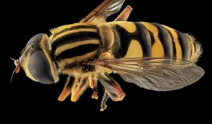 Keywords: striped hover fly macro mounted close up yellow jacket mimic wings insect yellow and black aelophilus fasciatus nature wildlife small