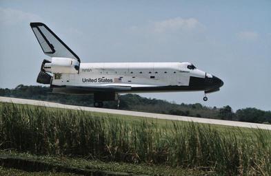 | Keywords: outdoor (10-13-1987) At the end of STS 41-G, the Space Shuttle Challenger lands at the Kennedy Space Center. The main landing gear has already touched down, but the nose remains in the air. (10-13-1987) At the end of STS 41-G, the Space Shuttle Challenger lands at the Kennedy Space Center. The main landing gear has already touched down, but the nose remains in the air. |