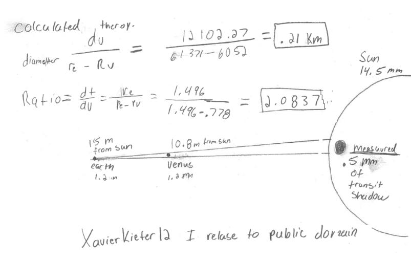 | Keywords: Student calculation of Venus projected on Sun during transit.svg this and this scale model of the solar system students were asked to explain the size of the image of the transit of Venus seen on the Sun This image was deliberately posted as svg so that others could attempt to improve it -- it's a wiki image that should perhaps be done in Inkscape 2016-04-12 User Guy vandegrift copied student work User XavierKiefer12 other versions cc-zero Physics diagrams - Wikiversity | ||||