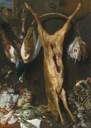 | Keywords: Studio of Frans Snyders Still Life of Artichokes, Grapes and a Melon In a Basket, a Hung Peacock,.jpg Still life of artichokes grapes and a melon in a basket a hung peacock roebuck and grouse together with a Parrot and a Monkey a cat jumping through a window beyond oil on canvas 169 3 by 120 6 cm http //www sothebys com Sotheby's Sale N08952 New York 2013-01-31 “2013-02-01 century 17 workshop of PD-art-100 Images from Sotheby's Still life paintings by Frans Snyders Still life paintings of food Dead deer in art |