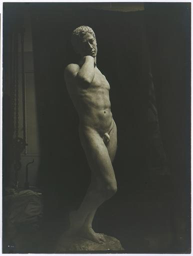 | Keywords: Study of a sculpture photography by Eugene druet.jpg en This study of an academic sculpture by an unidentified artist may have been made by Eugène Druet who worked with several sculptors besides Rodin As was common practice in record photography the white plaster nude has been set against an opaque black background The lateral lighting plays across the sculpture giving the chalky plaster the sensuousness of human flesh Despite this added dimension the picture would not hold our attention but for the inclusion of the wrapping material chain and tackle at the left The presence of these disturbing elements invests the image with an ominous tension the ordinary trappings of a sculptor's studio transformed into sinister instruments of torture ambiguously related to the languorous figure lost in solipsistic reverie fr Photographie d´une étude de sculpture scupetur inconnu attribuée à Eugène Druet http //www metmuseum org/Works_of_Art/collection_database/photographs/study_of_a_sculpture_eugene_druet//objectview aspx OID 190036428 collID 19 dd1 19 Creator Eugène Druet ~ 1900 PD-old Eugène Druet |