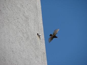 | Keywords: Sturnus vulgaris, Bystrc 03.JPG en Common starling leaves a nest built in a hole in the polystyrene isolation on the wall of an eight floor communal house The nest is in the height of about 13 metres own own photo HTO 2009-05-18 Sturnus vulgaris in flight |