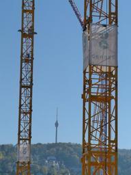 Keywords: stuttgart tv tower cranes construction sites scaffold sky blue