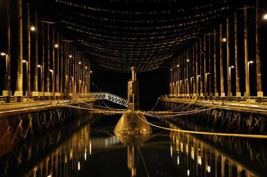Keywords: submarine military maintenance shipyard floating navy ship docked service night lights