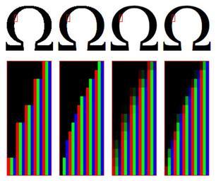 | Keywords: Subpixel rendering.png Auf Bildschirmen entsteht die Farbe Weiß durch additive Farbmischung der roten grünen und blauen Farbanteile Ist der Software die physikalische Anordnung dieser Teilbildpunkte Subpixel bekannt kann sie versuchen die Elemente durch Färben gezielt anzusteuern und so die Bildschärfe zu verbessern Der Effekt ist bei hochfrequenten Bildinhalten wie sie typischerweise bei Schrift auftreten besonders ausgeprägt Von links nach rechts ohne Kantenglättung; jedes Pixel ist entweder vollständig aktiviert Weißraum außerhalb des Schriftzeichens oder deaktiviert Pixel innerhalb des Zeichens reines Subpixel-Rendering; die drei Farbsegmente eines Bildpunkts werden durch die Wahl einer der 8 möglichen reinen Farbkombinationen getrennt aktiviert oder deaktiviert normales Antialiasing; Pixel in den Randbereichen die nur zum Teil innerhalb des Schriftzeichens liegen erhalten eine entsprechende Grautönung die sich durch gleichmäßiges Anheben der drei Farbkomponenten ergibt Subpixel-Rendering mit Antialiasing; die Subpixel der Bildpunkte in den Randbereichen werden durch stufenweises Anheben der Farbkomponenten getrennt angesteuert Eine Erhöhung der Bildschirmauflösung um den Faktor drei wie sie oft angegeben wird ist in der Praxis nicht gegeben da dann starke Farbsäume um die Schriftzeichen entstehen siehe Abbildung 2 Ein weiterer häufiger Fehler ist der direkte Vergleich zwischen der Darstellung völlig ohne und mit Subpixel-Antialiasing Abbildungen 1 und 4 Realistischer wäre der Vergleich mit dem klassischen Antialiasing Abbildungen 3 und 4 Die Implementierungen der Hersteller ClearType Quartz etc sind immer Mischformen aus Hinting in den Abbildungen hier nicht berücksichtigt Antialiasing und Subpixel-Rendering wobei Hinting das meiste und Subpixel-Rendering effektiv das wenigste zur Lesbarkeit beiträgt Visualization and comparision for the subpixel rendering technology From left to right No anti-aliasing Plain subpixel rendering Usual anti-aliasing Subpixel rendering with anti-aliasing own Created in Paint Shop Pro using average resampling No screenshots used 2005-12-02 TMg <gallery> File Antialias png File ClearType01 png File Antialias-vrs-Cromapixel png </gallery> Liquid crystal displays Anti-aliasing Font rasterization |