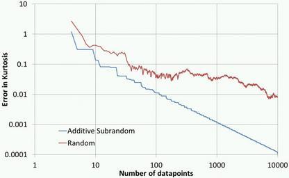 | Keywords: Subrandom Kurtosis.gif en Error in estimated kurtosis as a function of number of datapoints 'Additive subrandom' gives the maximum error when c sqrt 5 -1 /2 'Random' gives the average error over six runs of random numbers where the average is taken to help smooth out fluctuations own Mollwollfumble 2011-04-05 Check categories 2011 April 6 en wikipedia Subrandom_numbers 2 Randomness Number theory | ||||