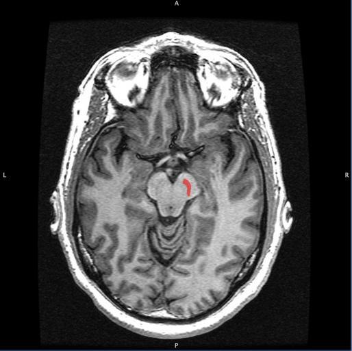 Keywords: Substantia Nigra.jpg en Horizontal MRI T1 weighted slice with highlighting indicating location of the substantia nigra own Geoff B Hall 2011-09-08 Cc-zero Magnetic resonance imaging of the brain Substantia nigra