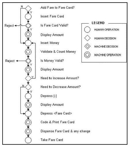 | Keywords: Subway Fare Card Machine Flow Process Chart.jpg en Subway Fare Card Machine Flow Process Chart Flow Process Charts - These charts are used to depict the sequence of operator activities or information transfer as part of a system A Flow Process Chart FPC is vertically oriented and can be annotated on either side with a time scale if the data is available These charts are developed to detail operator tasks and incorporate human and machine decision points http //www hf faa gov/webtraining/Usability/u19_tools3 htm faa gov webtraining FAA 2008 PD-USGov Flow process charts |