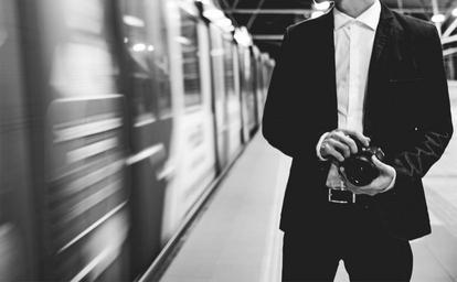 Keywords: subway train station transportation urban black and white guy man people camera photographer fashion