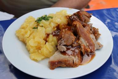 Keywords: suckling pig eat meat pig food delicious dish potato salad baden festival