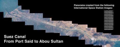 | Keywords: suez canal suez canal suezcanal international space station internationalspacestation expedition 43 expedition43 This is a panorama of the Suez Canal created from numerous images taken by the International Space Station Expedition 43 crew. The panorama shows almost the entire canal, beginning with Port Said in the north (on the left side) and ending with Abou Sultan in the south (on the right). Created using the following images: iss043e303011 iss043e303014 iss043e303017 iss043e303020 iss043e303023 iss043e303026 iss043e303029 iss043e303032 iss043e303035 iss043e303038 iss043e303041 iss043e303044 iss043e303047 This is a panorama of the Suez Canal created from numerous images taken by the International Space Station Expedition 43 crew. The panorama shows almost the entire canal, beginning with Port Said in the north (on the left side) and ending with Abou Sultan in the south (on the right). Created using the following images: iss043e303011 iss043e303014 iss043e303017 iss043e303020 iss043e303023 iss043e303026 iss043e303029 iss043e303032 iss043e303035 iss043e303038 iss043e303041 iss043e303044 iss043e303047 |