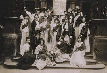 | Keywords: suffrage the women's library thewomenslibrary women history politics hires 7JCC/O/02/023Photograph, printed, paper, monochrome, a group of suffragettes posing on the steps of a building all wearing tartan sashes, Flora Drummond in the middle, a banner reading 'YE MAUNA TRAMP ON THE SCOTCH THISTLE LADDIE'; printed inscription on reverse 'Copyright: World's Graphic Press Limited, 36-38 Whitefriars Street, Fleet Street, London EC. Please Acknowledge'. [The occasion was a welcome for Mary Phillips, a Scot, on her release from prison] 7JCC/O/02/023Photograph, printed, paper, monochrome, a group of suffragettes posing on the steps of a building all wearing tartan sashes, Flora Drummond in the middle, a banner reading 'YE MAUNA TRAMP ON THE SCOTCH THISTLE LADDIE'; printed inscription on reverse 'Copyright: World's Graphic Press Limited, 36-38 Whitefriars Street, Fleet Street, London EC. Please Acknowledge'. [The occasion was a welcome for Mary Phillips, a Scot, on her release from prison] |
