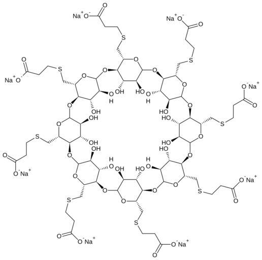 Keywords: Sugammadex sodium.svg Structural diagram of sugammadex sodium Created using http //www acdlabs com/download/chemsk html ACD/ChemSketch 10 0 and Inkscape Own 2007-01-09 Fvasconcellos Image Sugammadex sodium 3D front view png Image Sugammadex sodium 3D three quarters view png ”space-filling models Antidotes Polysaccharides Sodium salts of organic compounds Thioethers |
